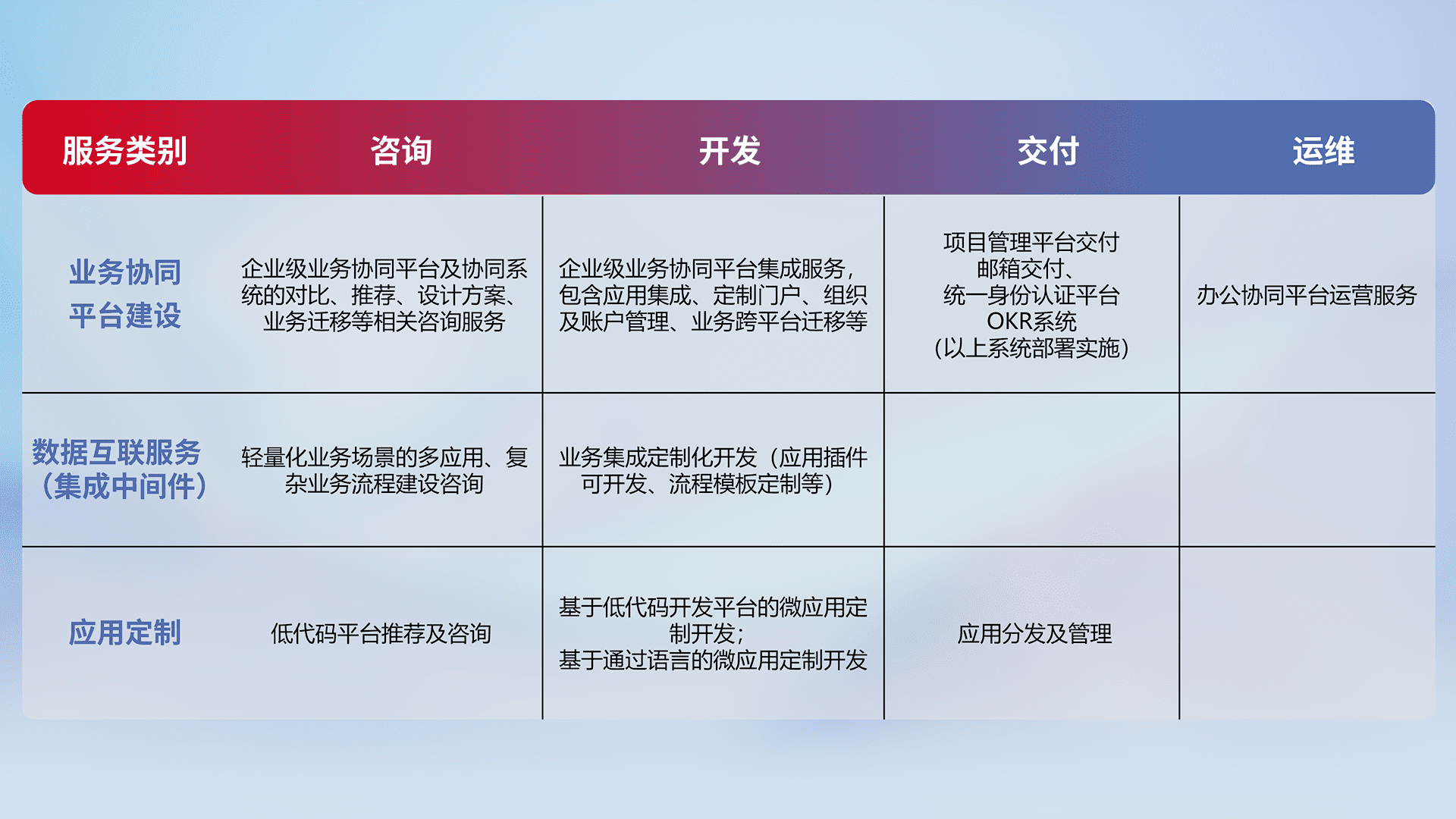 针对钉钉、、、企微、、IDaas等平台级产品提供产品的规划、、、方案、、、交付、、、定制化开发等服务,,,实现如统一协同办公、、智能客户服务、、、混合会议管理、、、、智能数据查询、、等业务场景,,,实现数字化转型。。。。